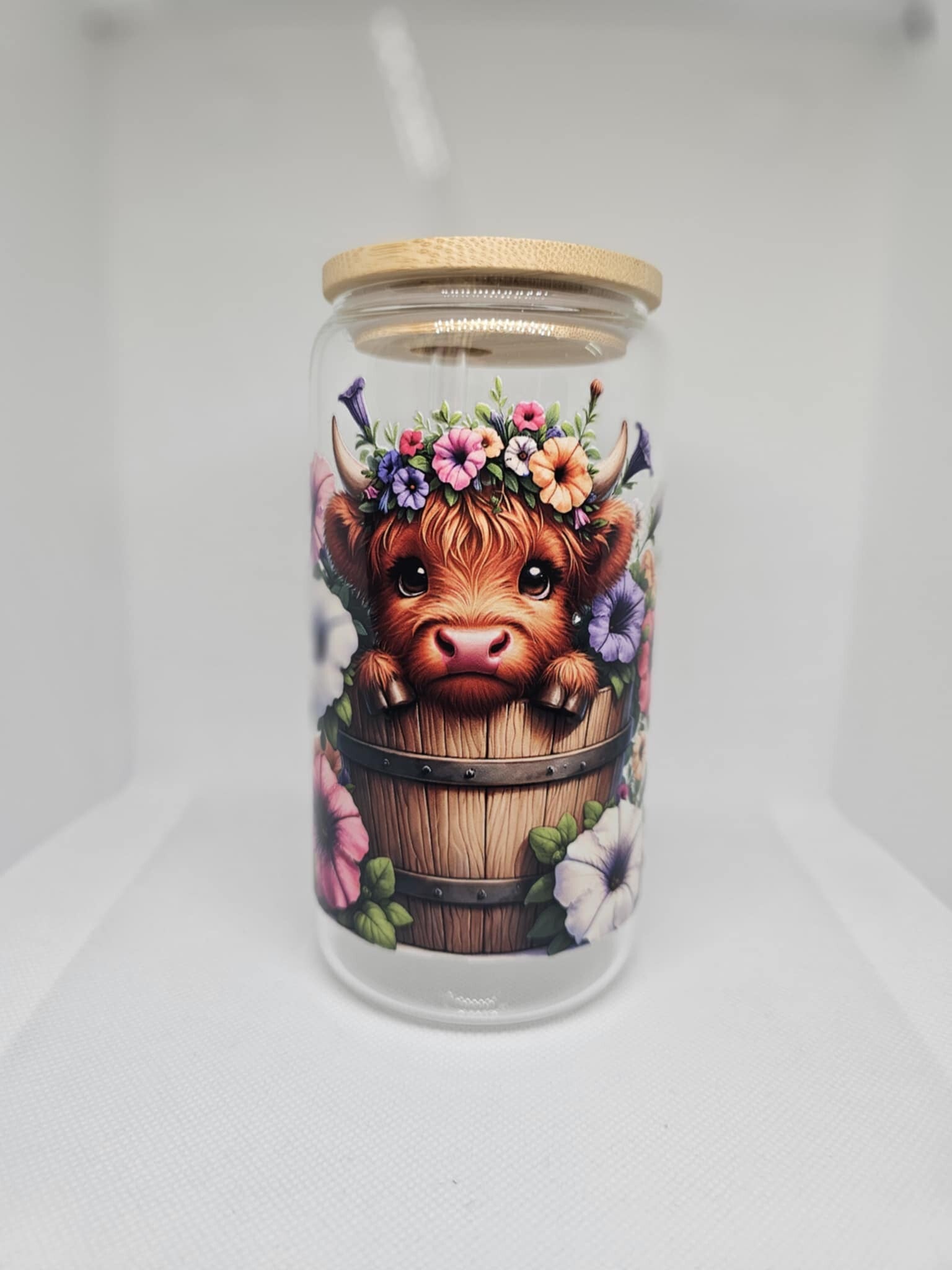 16oz Glass Tumbler – Baby Highland Cow in Wooden Drum with Floral Accents